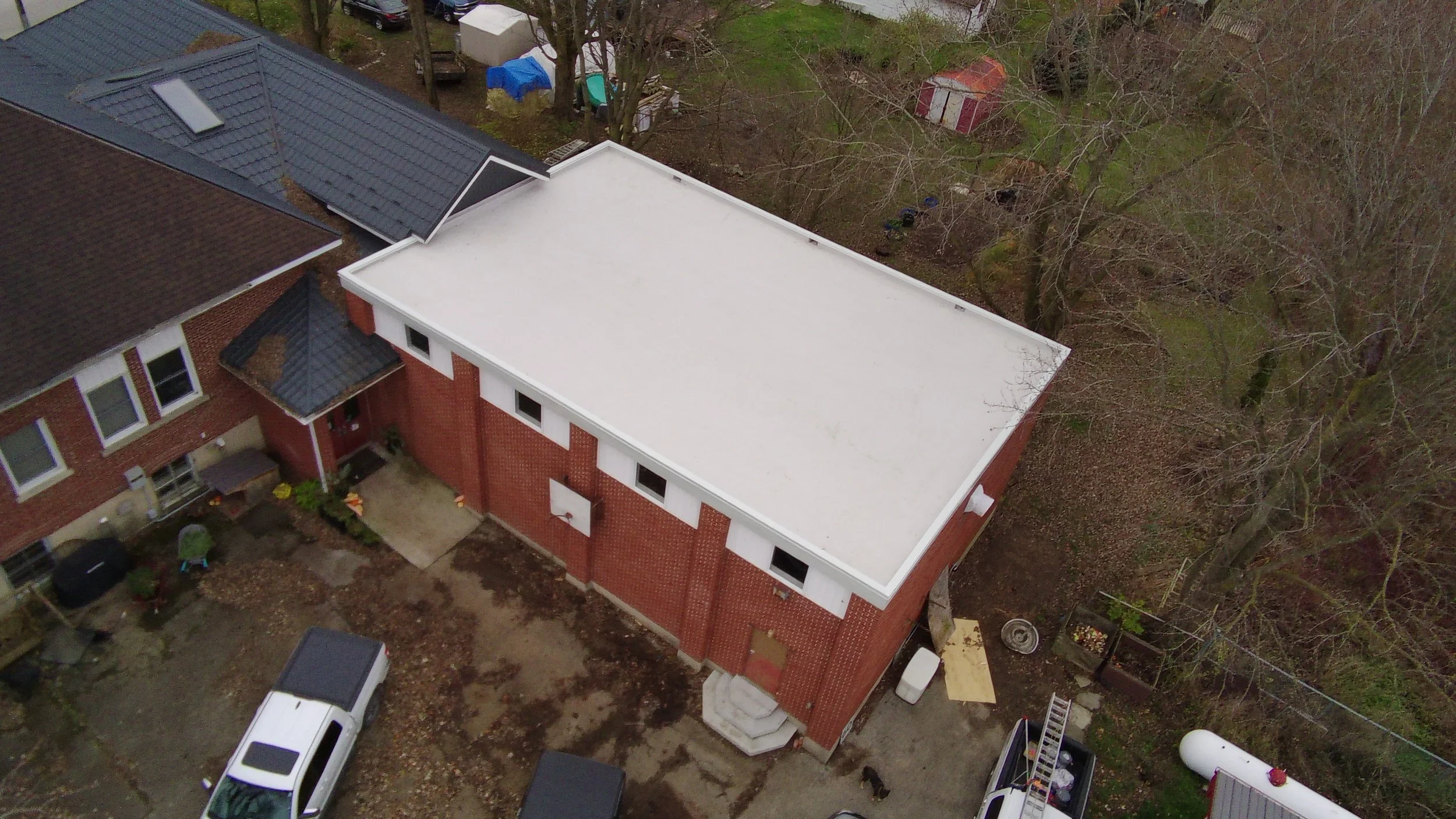 We used liquid silicone and polyester fabric to seal the perimeter of the roof as well as all rooftop protrusions.